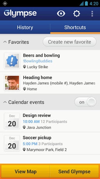 Glympse, inoltre, si sincronizza con il tuo calendario e ti consente di condividere rapidamente la tua posizione con gli altri partecipanti di una riunione poco prima che inizi, in modo che possano vedere che stai arrivando all'incontro.