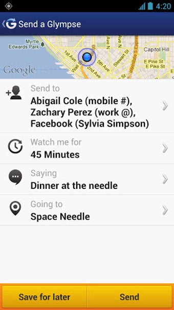 Glympse è un applicazione di geolocalizzazione gratuita che permette di condividere la tua posizione con chi vuoi. E' ideale per coloro che vogliono verificare se i propri cari sono arrivati ??a destinazione in modo sicuro o per coloro che vogliono sapere se i loro amici sono in zona.
